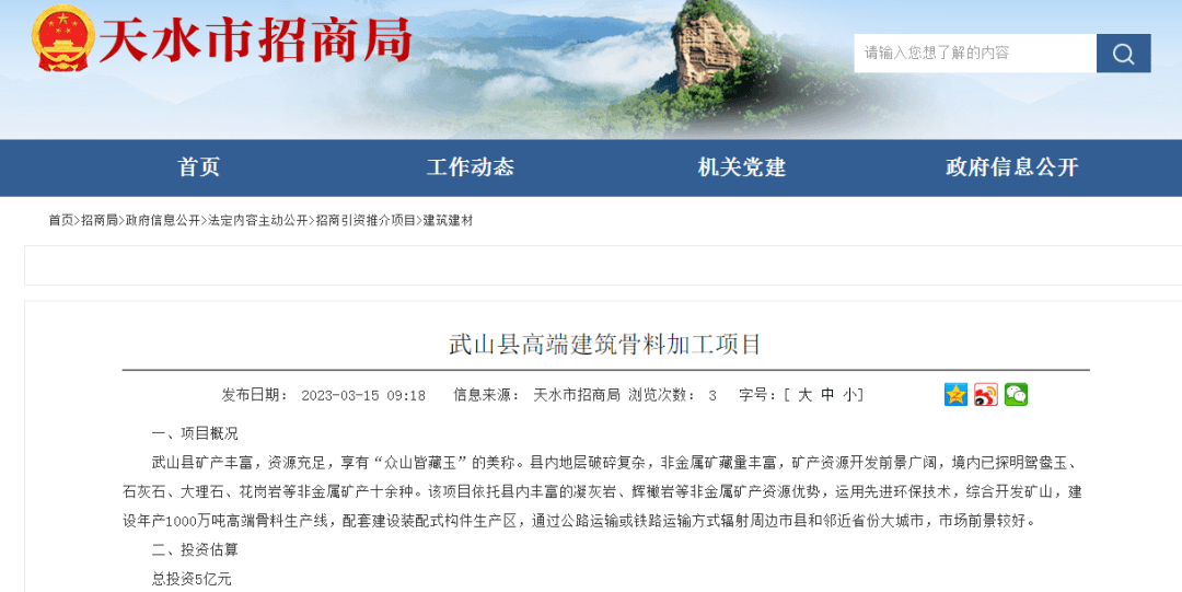 據(jù)中國砂石協(xié)會獲悉,近日,甘肅省天水市招商局公布了清水縣花崗巖建筑骨料生產(chǎn)項目和武山縣高端建筑骨料加工項目進展情況,兩個項目合計投資23億元,每年共計生產(chǎn)加工4000萬噸建筑骨料。資源儲量共計約為11.2億噸!目前兩個項目都已完成項目建議書。